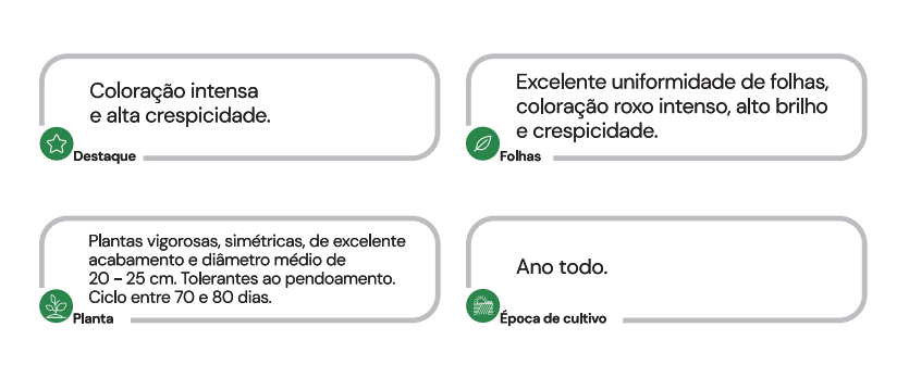 >Excelente uniformidade de folhas, coloração roxo intenso, alto brilho e crespicidade;