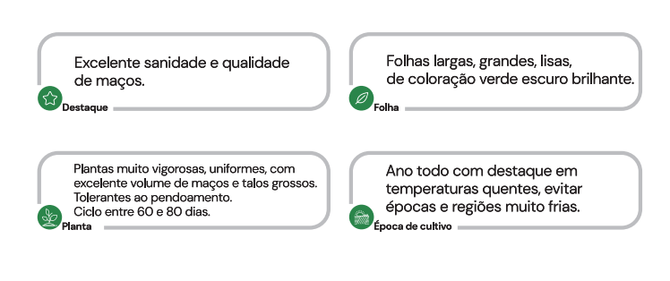 >Plantas muito vigorosas, uniformes, com excelente volume de maços e talos grossos. Tolerantes ao pendoamento;