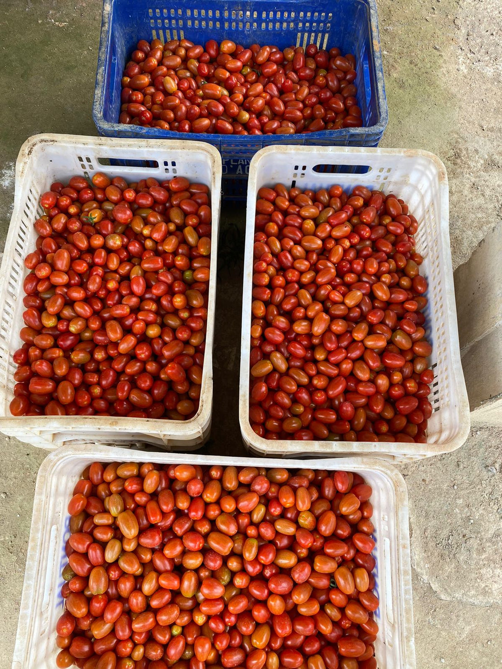 Frutos de formato grape, simétricos, peso médio de 20-25 g, polpa espessa e coloração vermelho intenso brilhante.