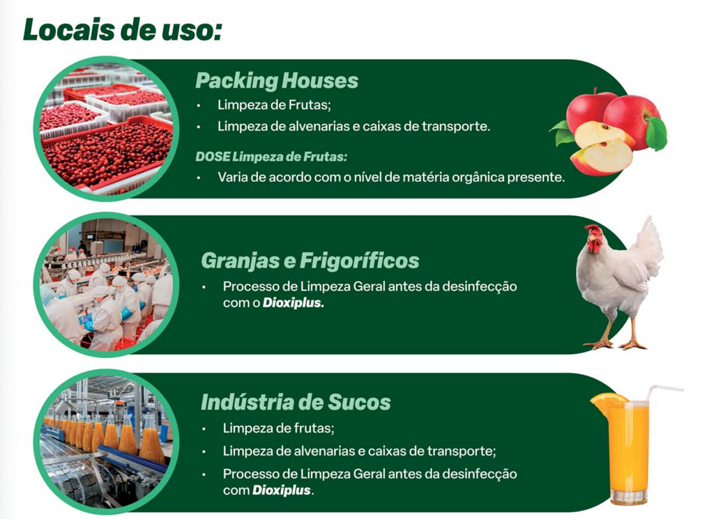 DIOXI CLEAN é um detergente neutro concentrado com alto poder de limpeza com excelente ação desengordurante, ideal para limpeza em packing houses (limpeza de frutas, alvenarias e caixas de transporte), granjas e frigoríficos (processo de Limpeza Geral antes da desinfecção com Dioxiplus) e indústria de sucos (Limpeza de frutas, alvenarias e caixas de transporte e processo de Limpeza Geral antes da desinfecção com Dioxiplus).